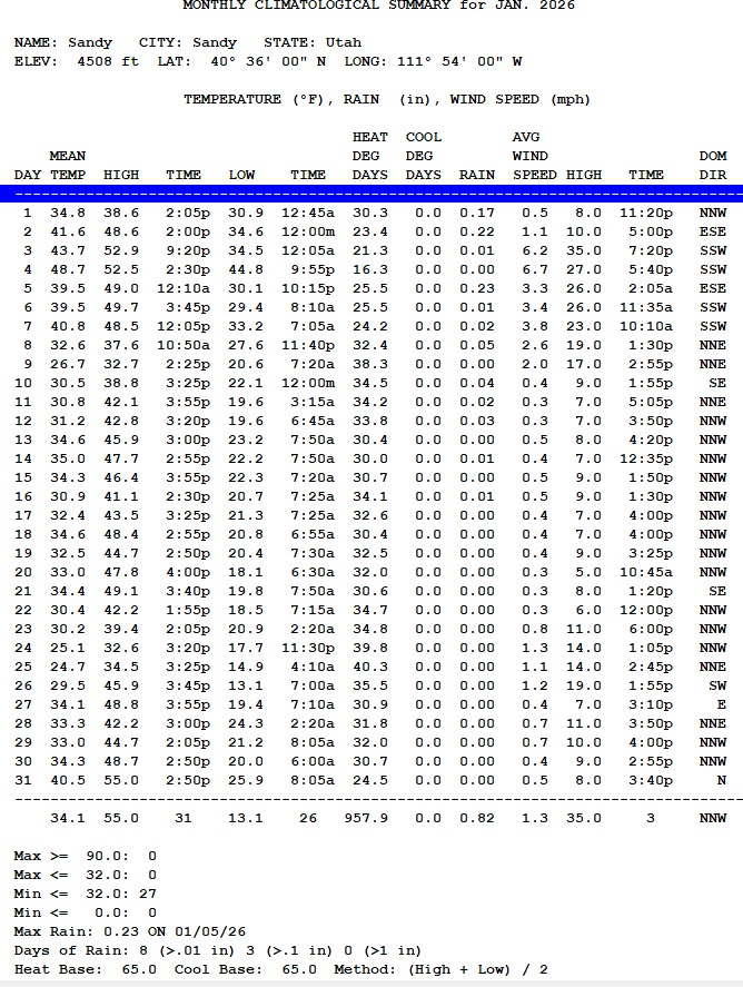 Temperatures were elevated. The mean temperature was 34.1 F (1.2 C) versus a twenty-nine-year average of 29.5 F (-1.4 C) or 4.1 F warmer. Precipitation was well below average. The total for 2026 was 0.82" (2.1 cm) versus a 29-year average of 2.50" (6.35 cm), well below normal.